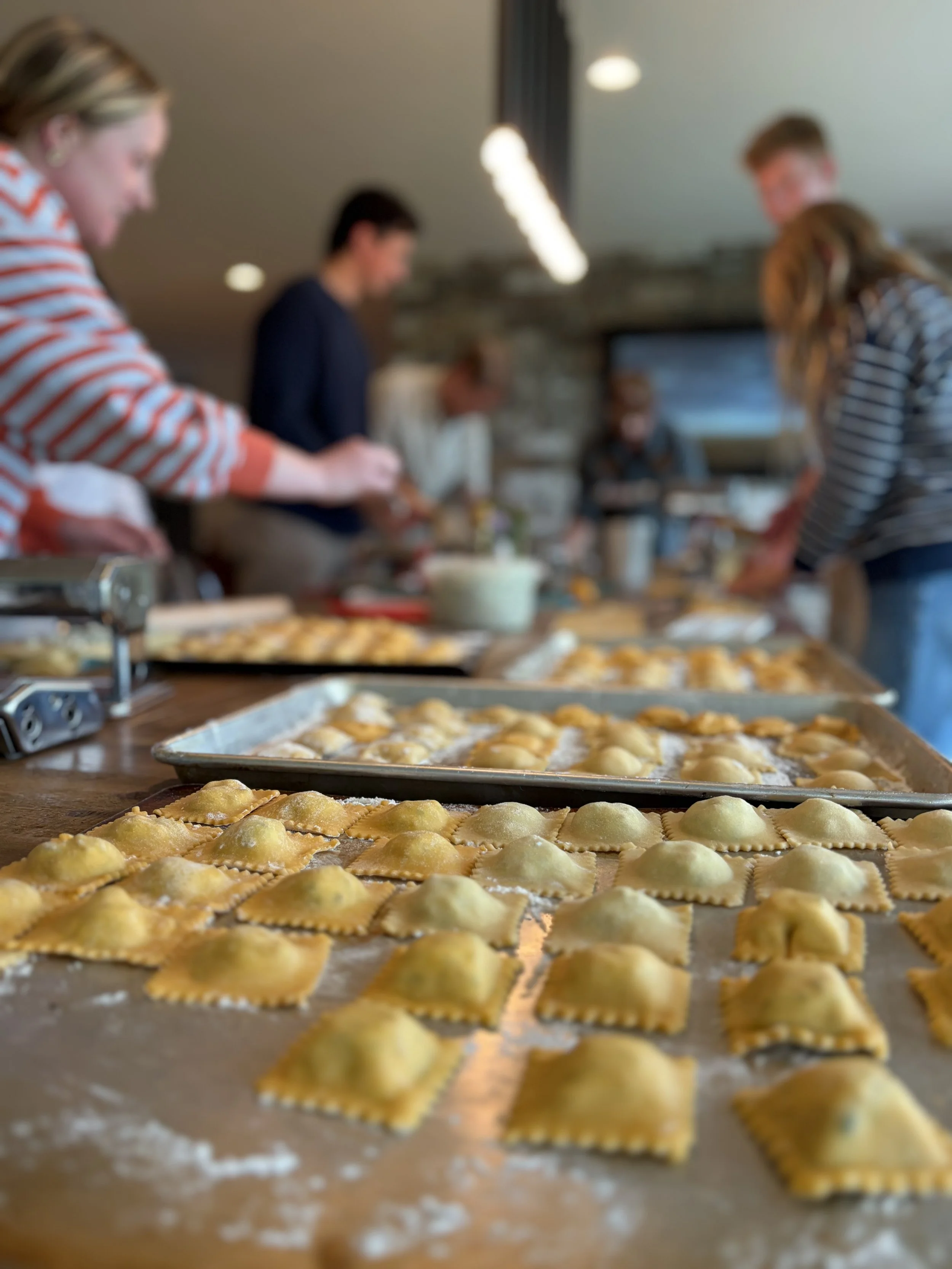 We’ve learned some things along the way like, more wine less bread, charcuterie to help the pasta makers stamina, and stick to one type of pasta. This year it was ravioli. Two kinds- sweet potato with a browned butter and shallots sauce; and meat filling with a marinara.